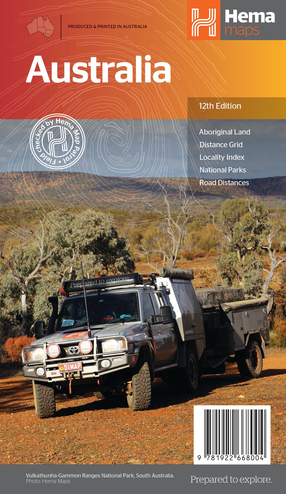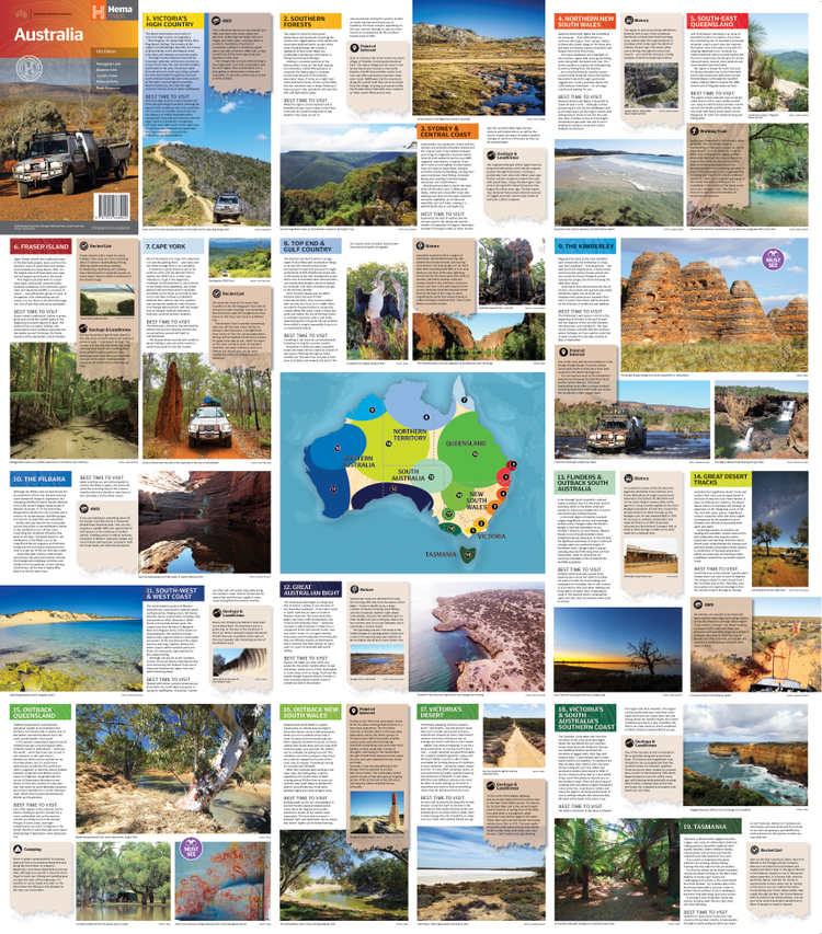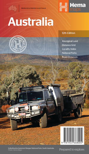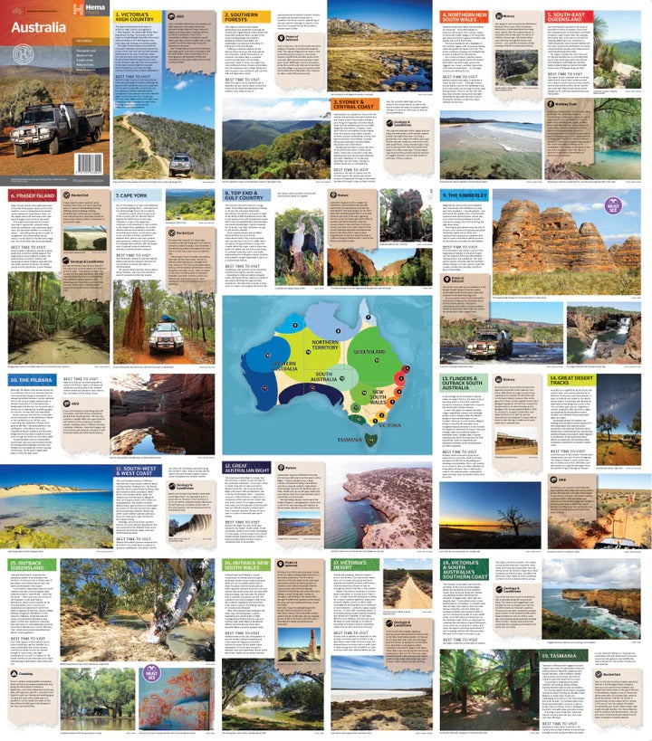 Hema’s iconic large map of Australia is ideal as a trip planning tool and travel companion. Marked on the map are localities, the major road network, distances and major national parks. The map also shows localities, the major road network, distances and major national parks. The visual appeal makes it perfect as a decorative map or an educational tool. On the reverse side is an overview of Australia's iconic touring regions featuring history, geology and landforms, nature, bucket-list attractions and iconic 4WD tracks.
