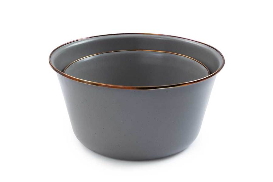 Process wet and dry ingredients to make all of your favourite sweets, breads, pastries, and more. Durable and sophisticated enough for both your camp kit and kitchen cooking, this Mixing Bowl Set features a hand-finished, baked stainless steel trim that creates a copper-like patina finish and matches our full enamelware line. Lightweight and stackable.