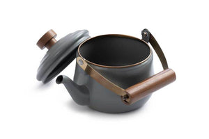 Our enamelware stainless steel rim is heat-treated to create a copper-like patina finish. Both the surface and rim can be stripped of its unique coloring by acidic foods, such as lemon, and some harsh detergents and cleansers. We recommend hand washing the teapot to protect the natural walnut wood and help maintain the original look and feel of the enamelware pieces.