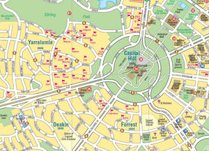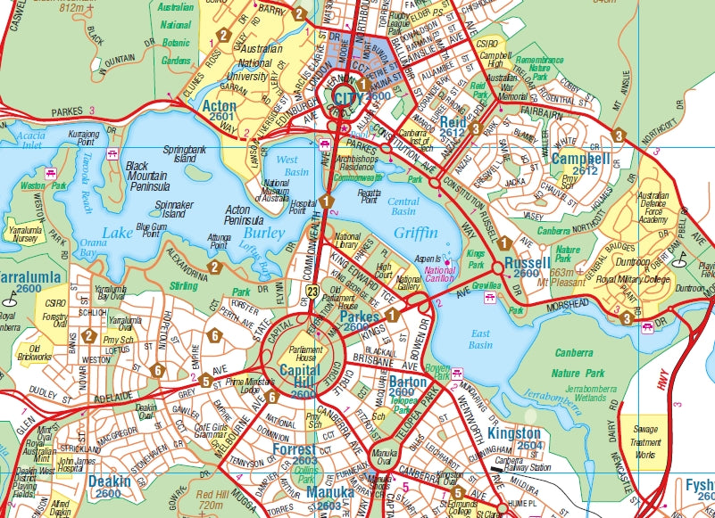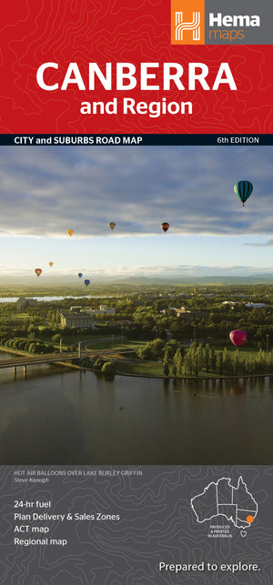 The Canberra and Region map combines a Canberra suburbs map (1:53,715) and a town and suburbs index (with postcodes) with maps of Canberra City, ACT (1:375:00), and the Canberra Region (1:850,000). Marked on the maps are points of interest, tourist attractions, 24-hour fuel, accommodation, railway stations, shopping centres and more.