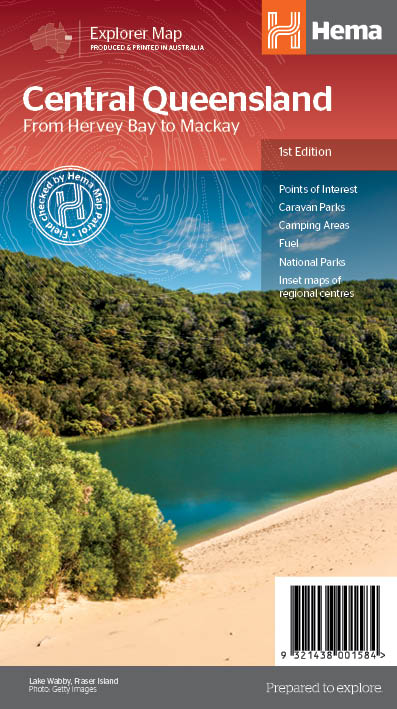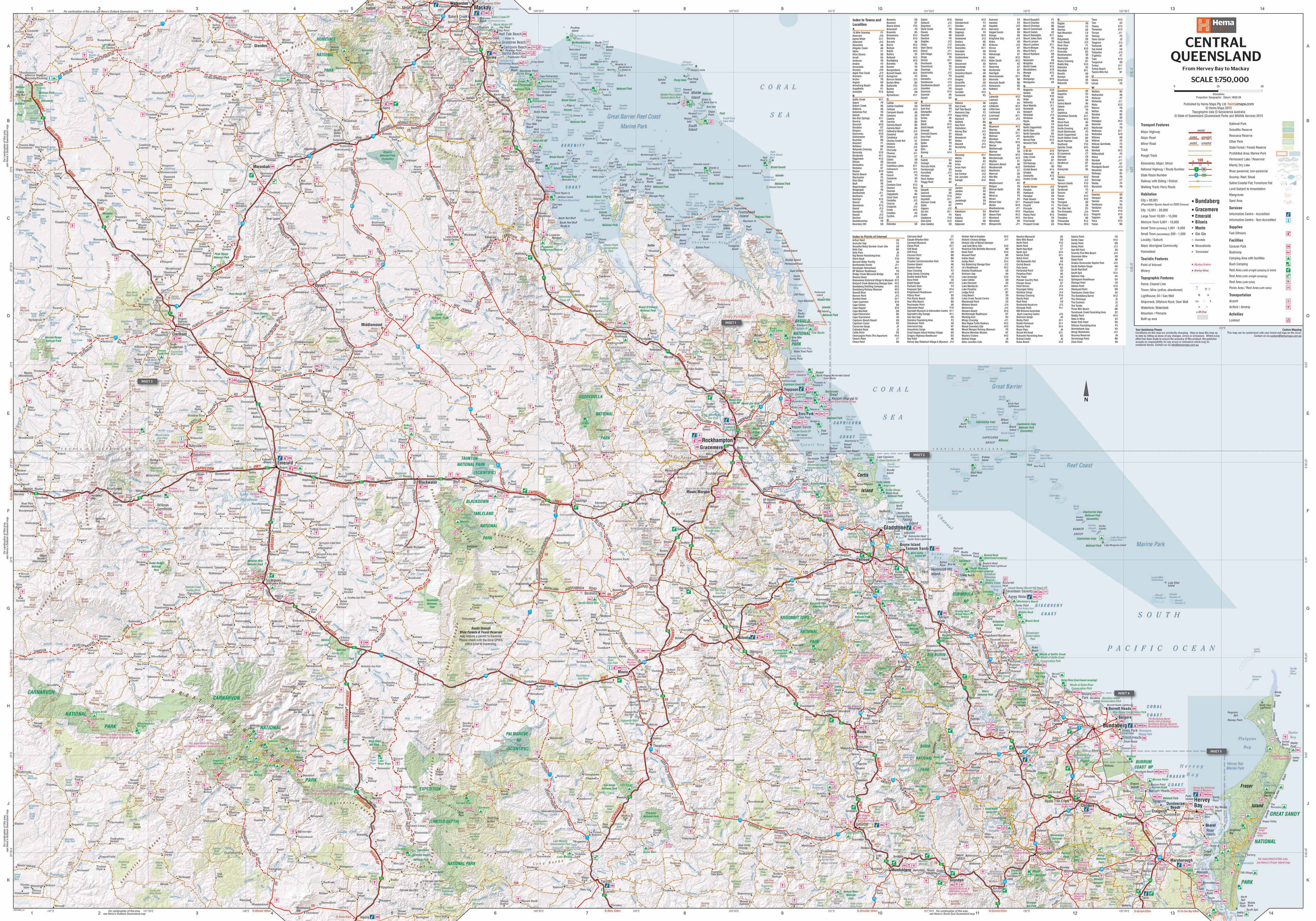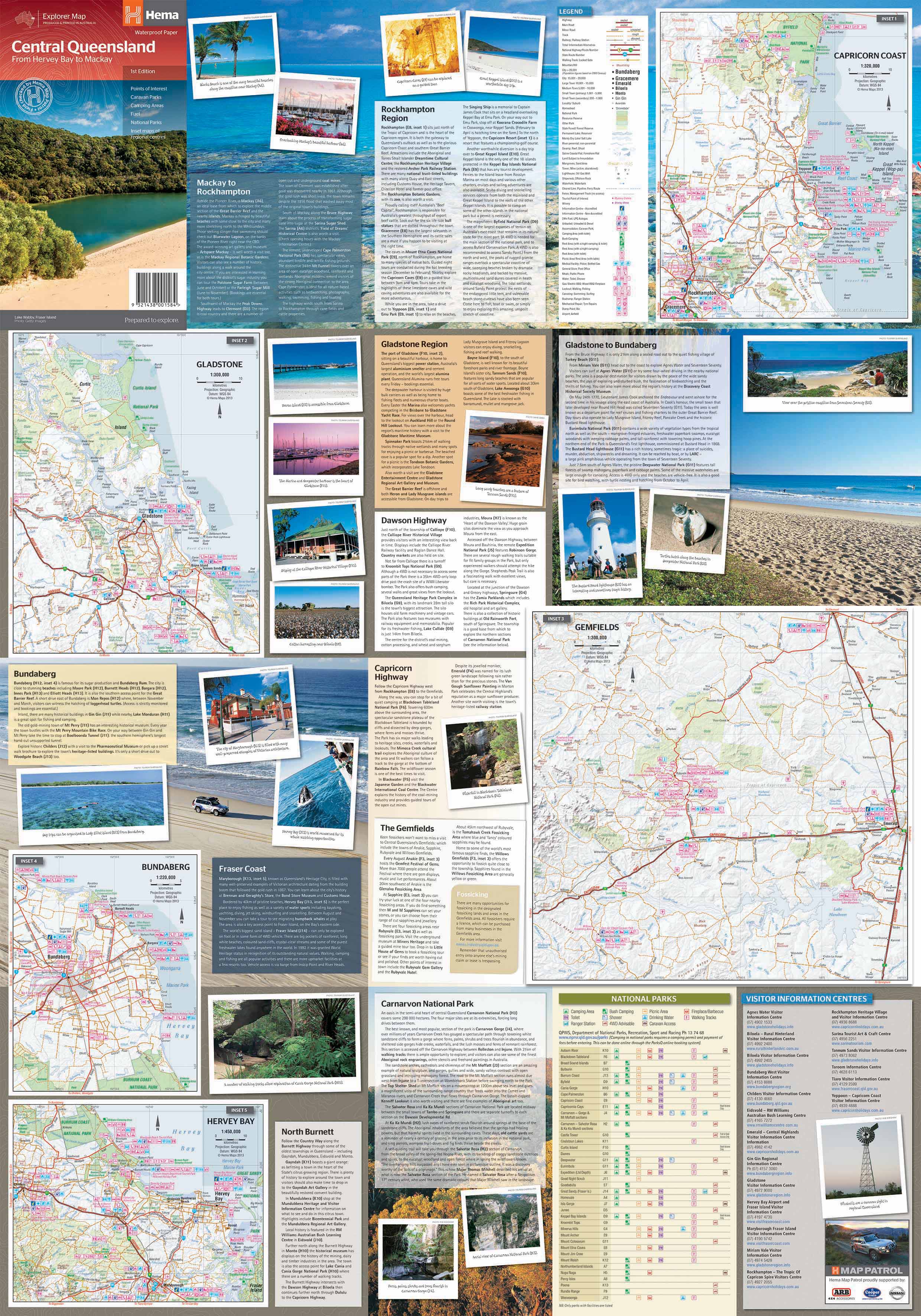 A regional map of central Queensland (1:1,000,000) that stretches inland past Jericho and from Maryborough in the south to Mackay in the north. On the opposite side is tourist information on the region, as well as inset maps of Mackay, the Capricorn Coast, Gladstone, Bundaberg, Rockhampton, and the Gemfields. Accompanying each inset map are photos as well as background and travel information on the region that help for planning and touring.