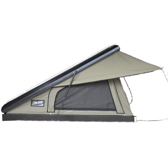 Designed and manufactured in South Africa, the Bush Company’s Classic – Clamshell Tent is unrivalled in its quality, simplicity and practicality. With a setup/pack down time of under 90 seconds and a 75mm high density foam mattress 1.3m wide and 2.15m long, this really is the ultimate in comfort and convenience and a superb addition to any camping/touring setup. Three large doors provide excellent airflow and all have high quality midge mesh and a canvas door. There is 12V power pre-installed, including an LED light in the roof of the tent, and 1.8m extruded roof rails as well as heavy duty extruded rails on the underneath of the tent making fitment to vehicles or canopies incredibly easy.