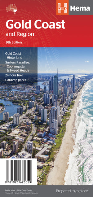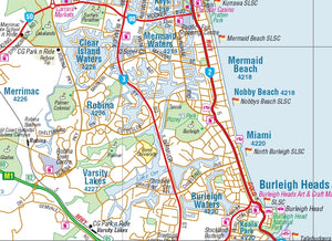 This map of the Gold Coast includes detailed mapping of the city (1:15,000) and suburbs (1:50,000), as well as a comprehensive overview of the surrounding Gold Coast Hinterland (1:100,000).