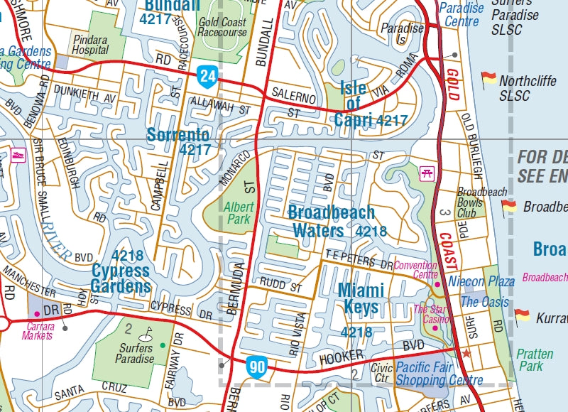 It contains plenty of useful visitor information marked on the mapping for staying in and getting around the Gold Coast, including fully updated roads, facilities and accommodation and theme parks.