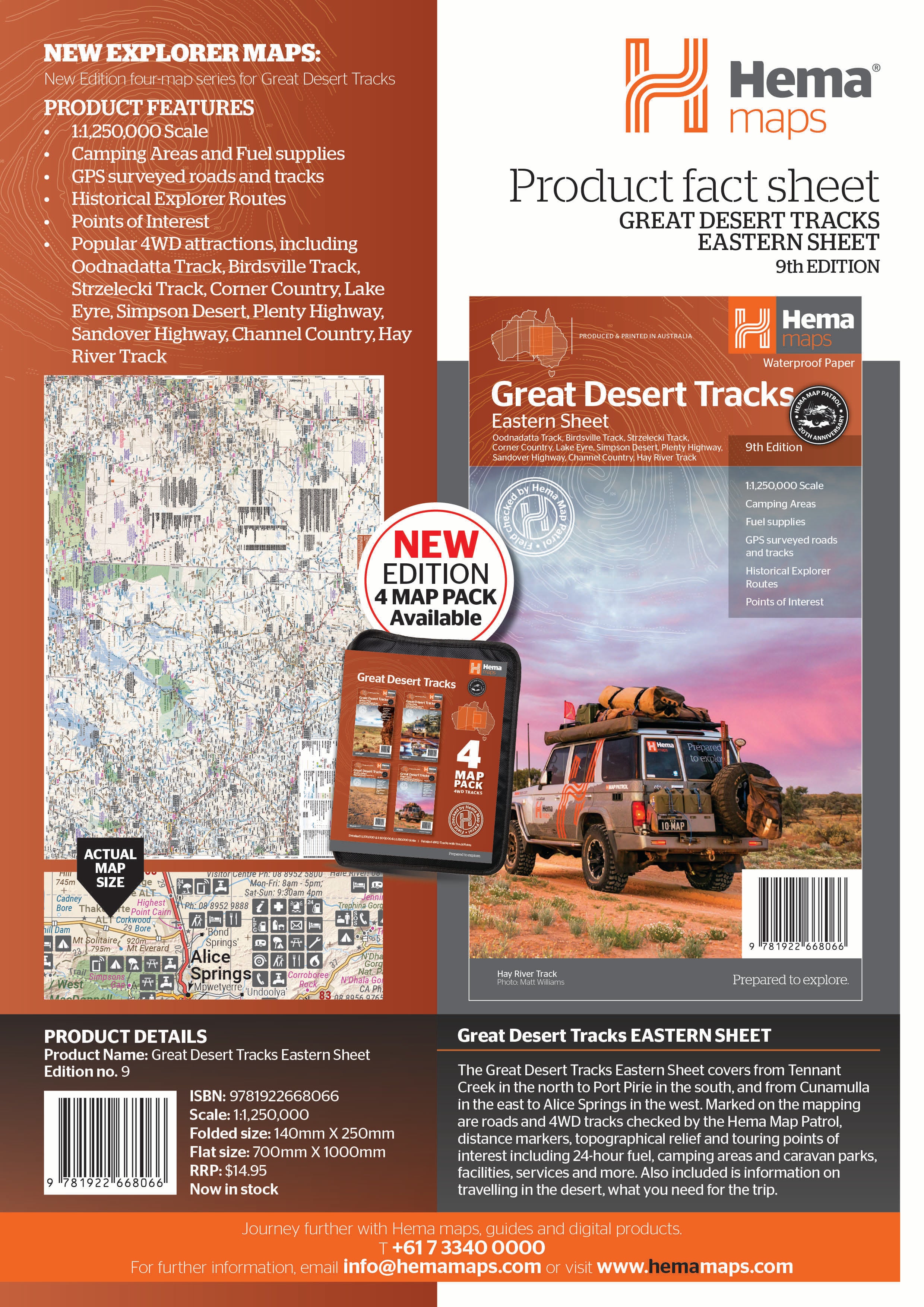 Hema's Great Desert Tracks maps are essential for anyone travelling in the Australian outback. The mapping features roads and 4WD tracks field-checked by the Hema Map Patrol, Points of Interest for remote area travellers and touring information for learning more about the region and planning your journey.