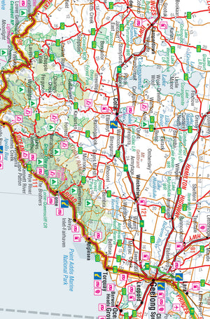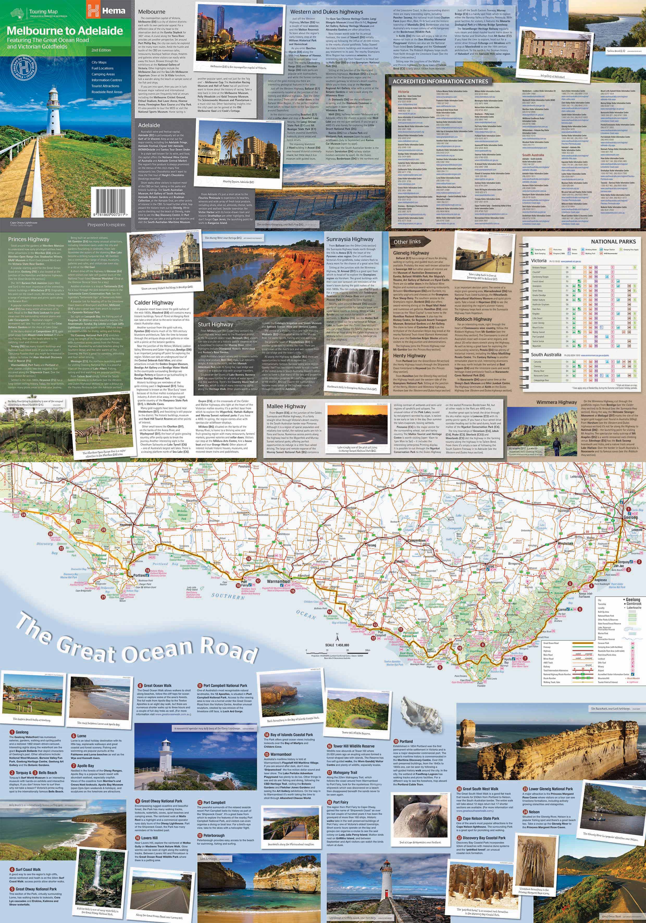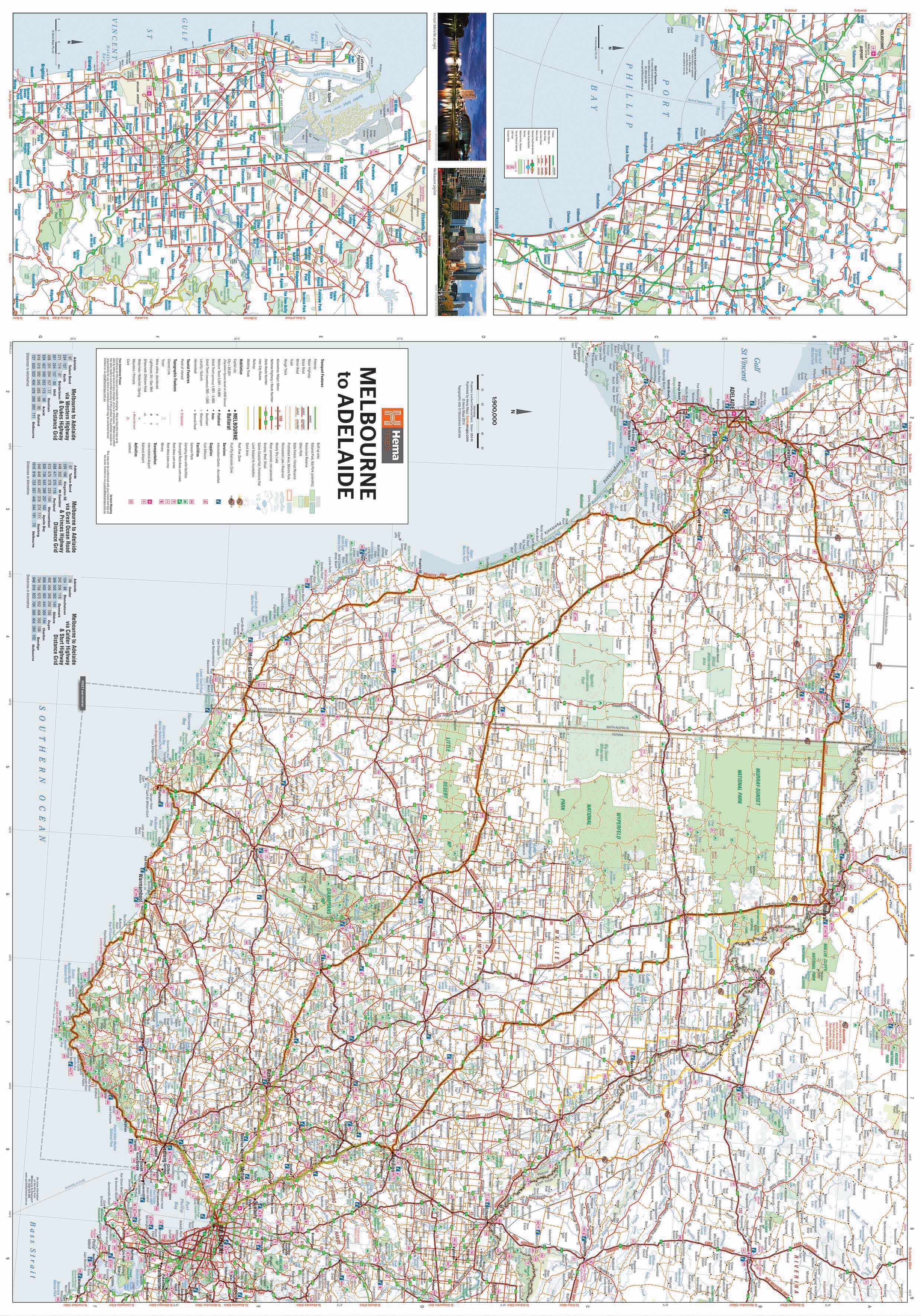 This touring map traverses Australia from Melbourne to Adelaide (1:900,000) and features an inset map of the Great Ocean Road (1:450,000). The latter map pinpoints significant locations along the route with tourist information attached and is accompanied by other useful information to illuminate the journey. Through-road maps of Melbourne to Adelaide are also included.