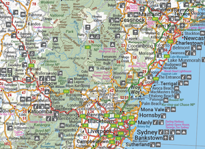 New South Wales State Map Wall Map - Wall map of the state of New South Wales featuring Hema's customary mapping detail including National Parks, major road networks, and distances. Available in two sizes, your choice of laminated or unlaminated paper and whether you want a variation with no symbols. Printed in Australia.