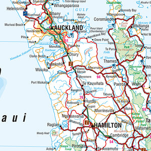Wall map of New Zealand (Aotearoa) featuring Hema's customary mapping detail including National Parks, major road networks, and distances. Single-sided map in two sizes and your choice of finish from laminated paper, unlaminated or laminated (encapsulation).