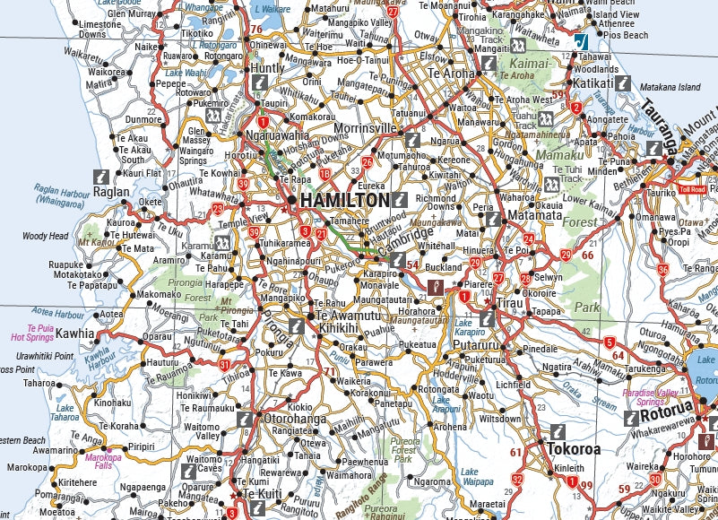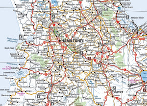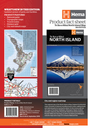 A regional map of the North Island of New Zealand (NZ) at a scale of 1:1,000,000. Marked on the mapping are points of interest, tourist routes, walking tracks and national parks for touring the island. On the reverse are city maps of Auckland, Wellington, Whangarei, Napier, Kerikeri, Hamilton, Gisborne, New Plymouth, Palmerston North, Rotorua, Russell, Paihia and Tauranga, as well as Auckland and Wellington suburbs maps and a map or Te Urewera National Park. Also included is a distance grid.
