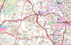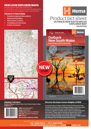 A regional map of outback NSW (1:1,100,000) that ranges from Tamworth in the east to Broken Hill in the west, as well as from Wagga Wagga in the south to past the Queensland border in the north. On the opposite side is extensive information on numerous regions, including visitor, historical and background information. Covered regions include the Broken Hill region, Corner Country, east of Tibooburra, the White Cliffs region, Cobar and surrounds, around Back o'Bourke, Lightning ridge and surrounds, Wentworth region, Balranald, Griffith region, Dubbo and surrounds, Kinchega National Park, Mungo National Park, Sturt National Park and Mutawintji National Park.