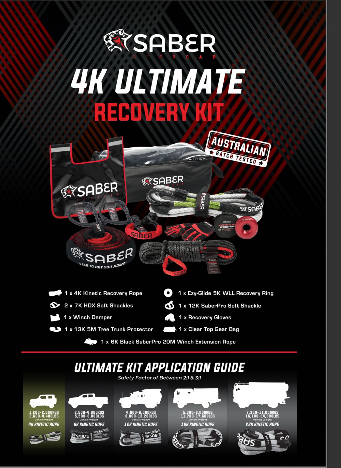 The Saber Ultimate Recovery Kit – 4K is purpose-built for light 4WDs and side-by-side vehicles, offering a complete solution for mechanical and kinetic recoveries. Whether you're tackling tough off-road tracks or assisting in vehicle extractions, this kit has the high-performance gear you need to get the job done safely.