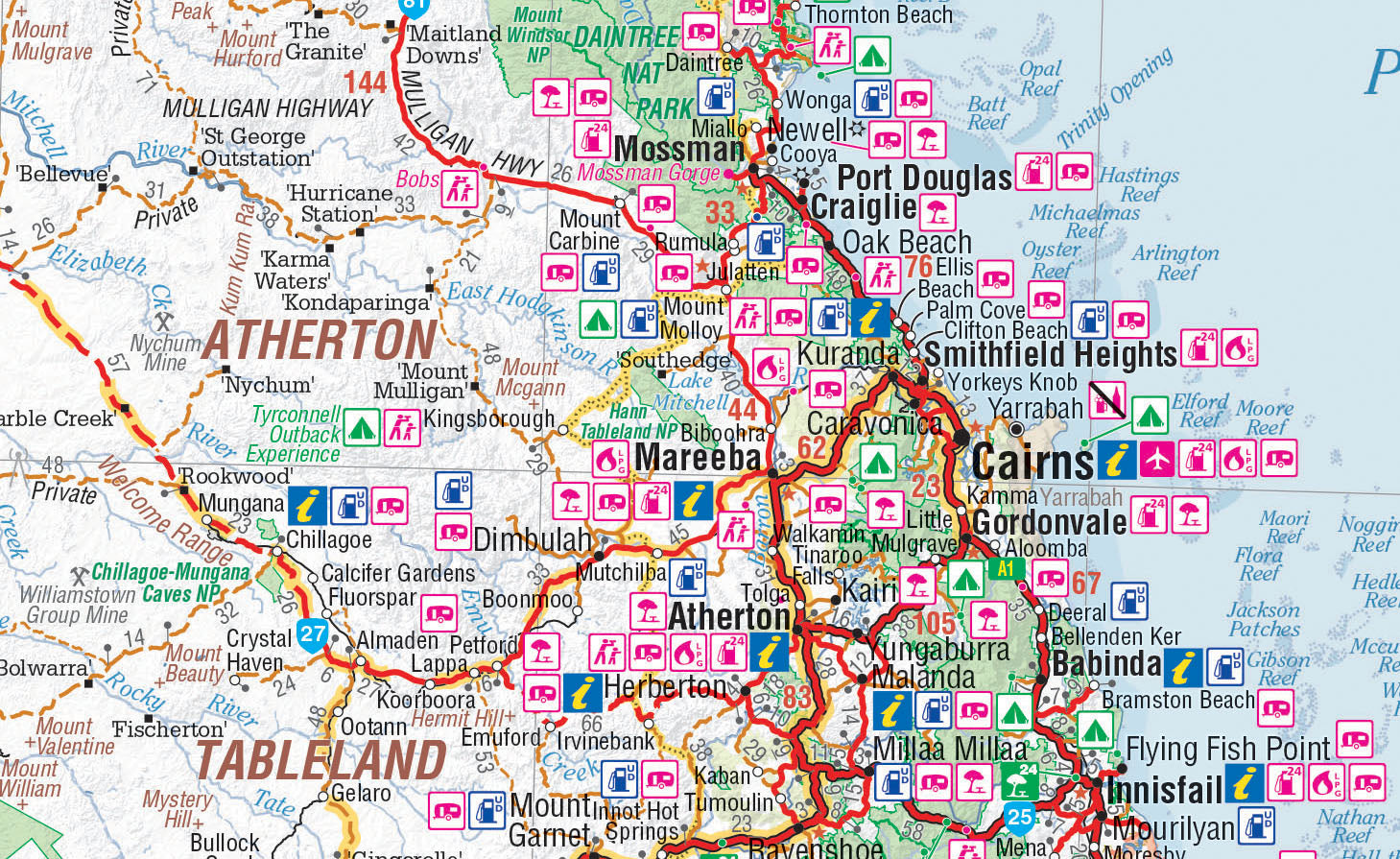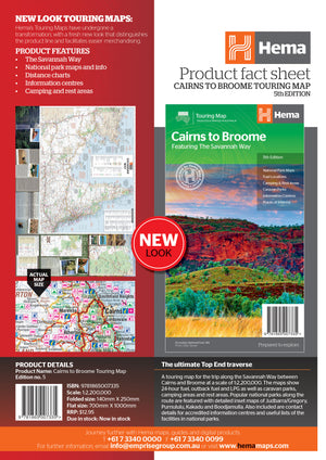 A touring map for the trip along the Savannah Way between Cairns and Broome at a scale of 1:2,200,000. The maps show 24-hour fuel, outback fuel and LPG as well as caravan parks, camping areas and rest areas. Popular national parks along the route are featured with detailed inset maps of Judbarra/Gregory, Purnululu, Kakadu and Boodjamulla. Also included are contact details for accredited information centres and useful lists of the facilities in national parks.