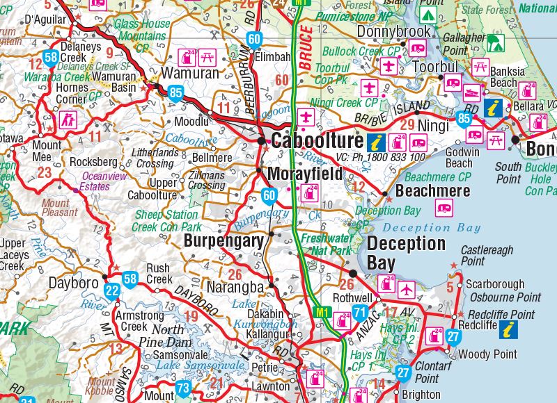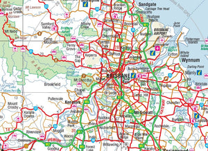 A regional map of South East Queensland (1:500,000) that stretches from the New South Wales-Queensland border to past Bundaberg, with maps of the Brisbane Region (1:300,000), Brisbane City and the Gold Coast on the opposite side.