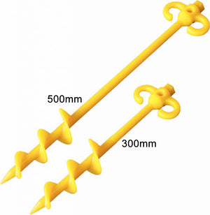 Made with 100% high impact polycarbonate plastic for superior strength and longevity. Made with a 15mm shaft and 50mm auger, it will easily screw into the sand and loose soil. The head of the peg also has a 24mm socket so you can use a cordless drill and 2 large lashing hooks to secure your awning or tent. The 300mm is ideal for sand and soft soil.