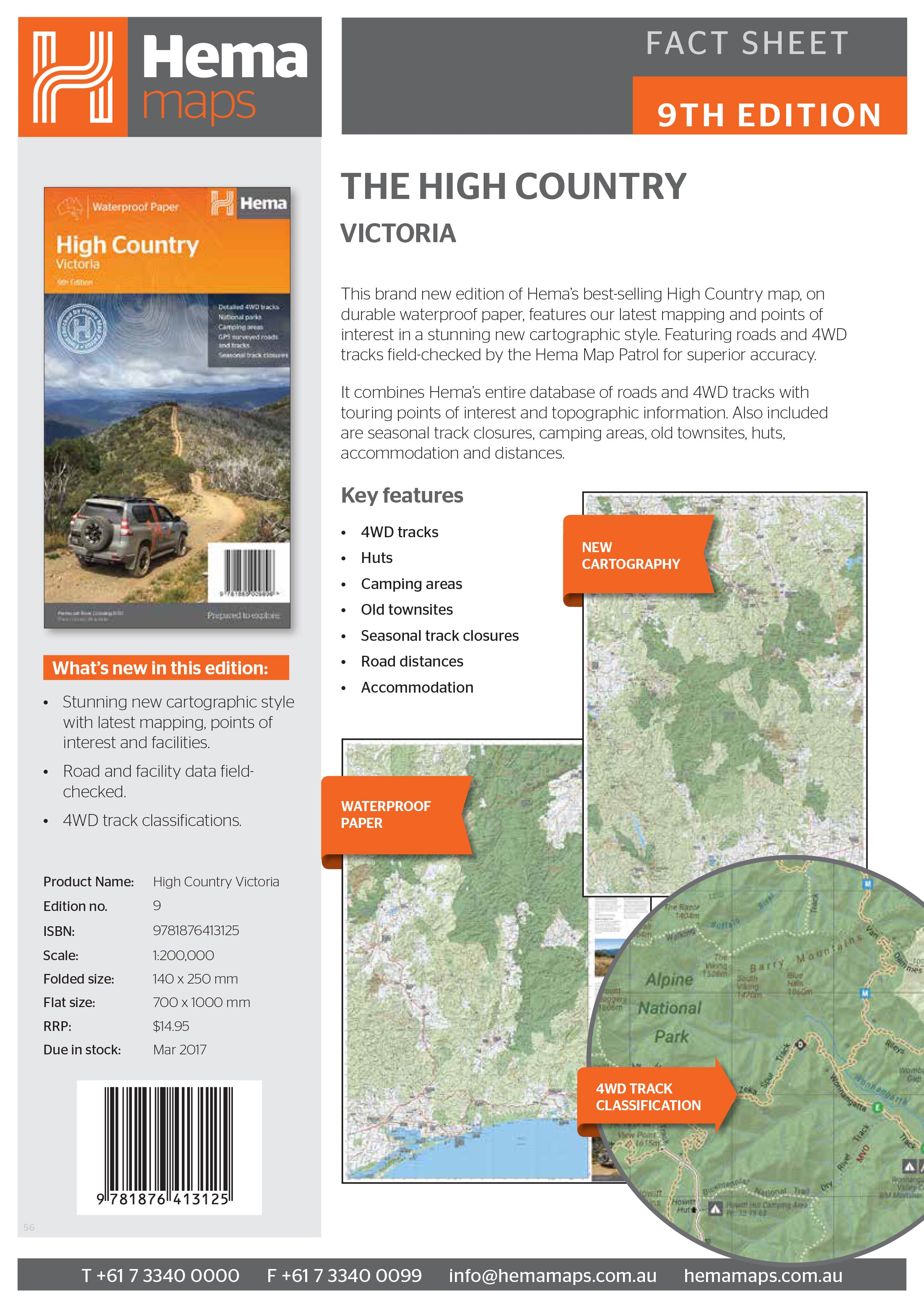 This edition of Hema’s best-selling High Country map, on durable waterproof paper, features Hema's iconic mapping and extensive points of interest. Featuring roads and 4WD tracks field-checked by the Hema Map Patrol for superior accuracy.