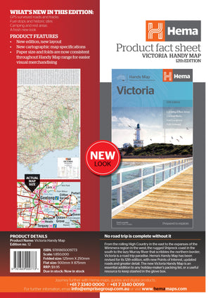 From the rolling High Country in the east to the expanses of the Wimmera region in the west; the rugged Shipwreck Coast in the south to the lazy Murray River that scribbles the northern border; Victoria is a road trip paradise. Hema's Handy Map has been revised for its 12th edition, with, updated roads, greater detail, distance grid and index for planning and reference. Also marked on the mapping are highways, major and minor roads, points of interest, information centres, picnic areas, caravan parks and lookouts. The Victoria Handy Map is an essential addition to any holiday-maker's packing list, or a useful resource to keep stashed in the glove box.