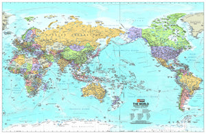 A flat, large laminated world political Pacific-centred map with relief shading to accurately depict each country and ocean’s topography, and includes the International Date Line. A World map that is perfect as either an educational tool, a reference point, or for decoration.